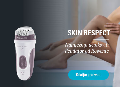 Rowentin najmekši učinkoviti depilator* Depilator koji poštuje vašu kožu, ne žrtvujući učinkovitost za savršene rezultate. Skin Respect depilator za žene kombinira visokoučinkovito uklanjanje dlačica s inovativnom tehnologijom njege kože, a rezultat je savršeno glatka koža. Može se koristiti i pod vodom i ima glatku glavu koja poštuje kožu, pa će vam depilacija svaki put biti ugodno iskustvo. *u usporedbi s ostalim Rowentinim depilatorima